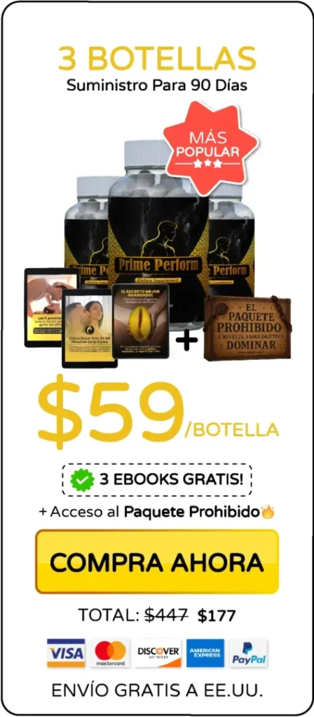 Prime Perform es un suplemento alimenticio formulado con ingredientes botánicos como Epimedium y Eurycoma Longifolia, diseñado para apoyar la vitalidad y el bienestar energético masculino de manera natural. No es un suplemento.